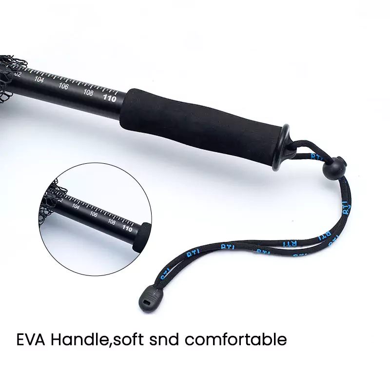 RTI’s aluminium landing fishing net is a foldable triangular landing net designed. The product pairs a 60 cm handle and a 50×40 cm head for a total length of 110 cm. It uses an aluminum shaft for light strength, an EVA grip for comfort, and rubber-coated multifilament netting to protect fish and reduce hook snags.
