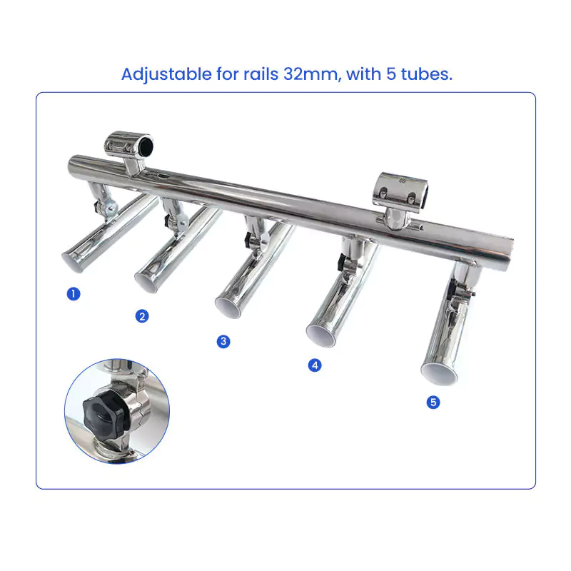 Adjustable bracket clamps to 32mm rails for quick installation on most boats. - Five-Rod Capacity with Compact Footprint: