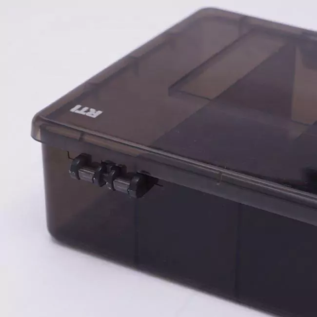 RTI’s waterproof fishing storage box is a PP lure box sized 30 × 13 × 5 cm. It weighs about 35 g and holds roughly 1.6 L. The clear grey lid shows contents at a glance. The one-sided layout has seven compartments and heavy-duty latches that seal out dust and sand.